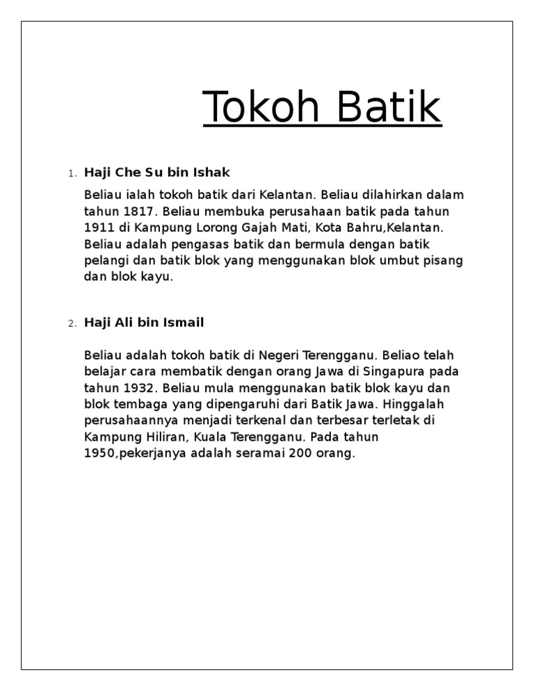 He was a nationalist and his. Kajian yang dijalankan lebih tertumpu terhadap pengasas batik di Kelantan iaitu Haji Che Su bin Ishak yang masih ramai tidak mengetahui mengenai pelopor batik di Kelantan. Beliau membuka perusahaan bati pada tahun 1911 di Kampung Lorong Gajah Mati Kota Bahru.